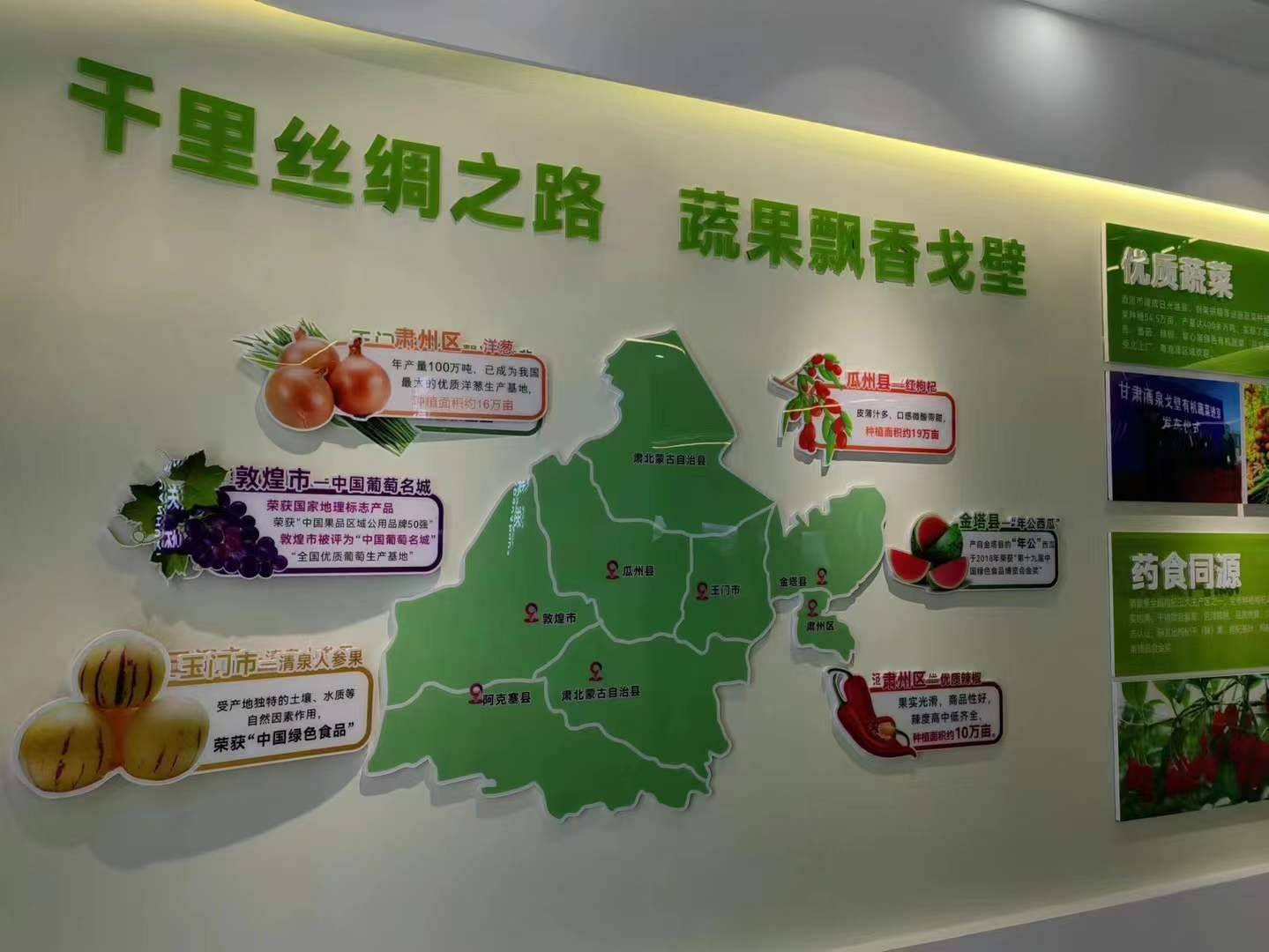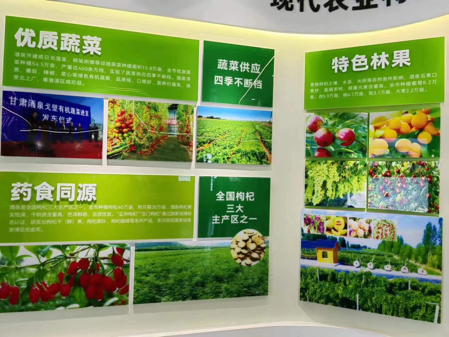 酒泉市是典型的灌溉农业区和绿洲农业区,日照时间长,昼夜温差大,特色农业发展条件好。大力发展戈壁设施农业,建成以日光温室、钢架大棚为主的戈壁生态设施农业示范基地、示范点122个,其中万亩园区12个、千亩园区32个,全市戈壁设施农业面积突破20万亩。
